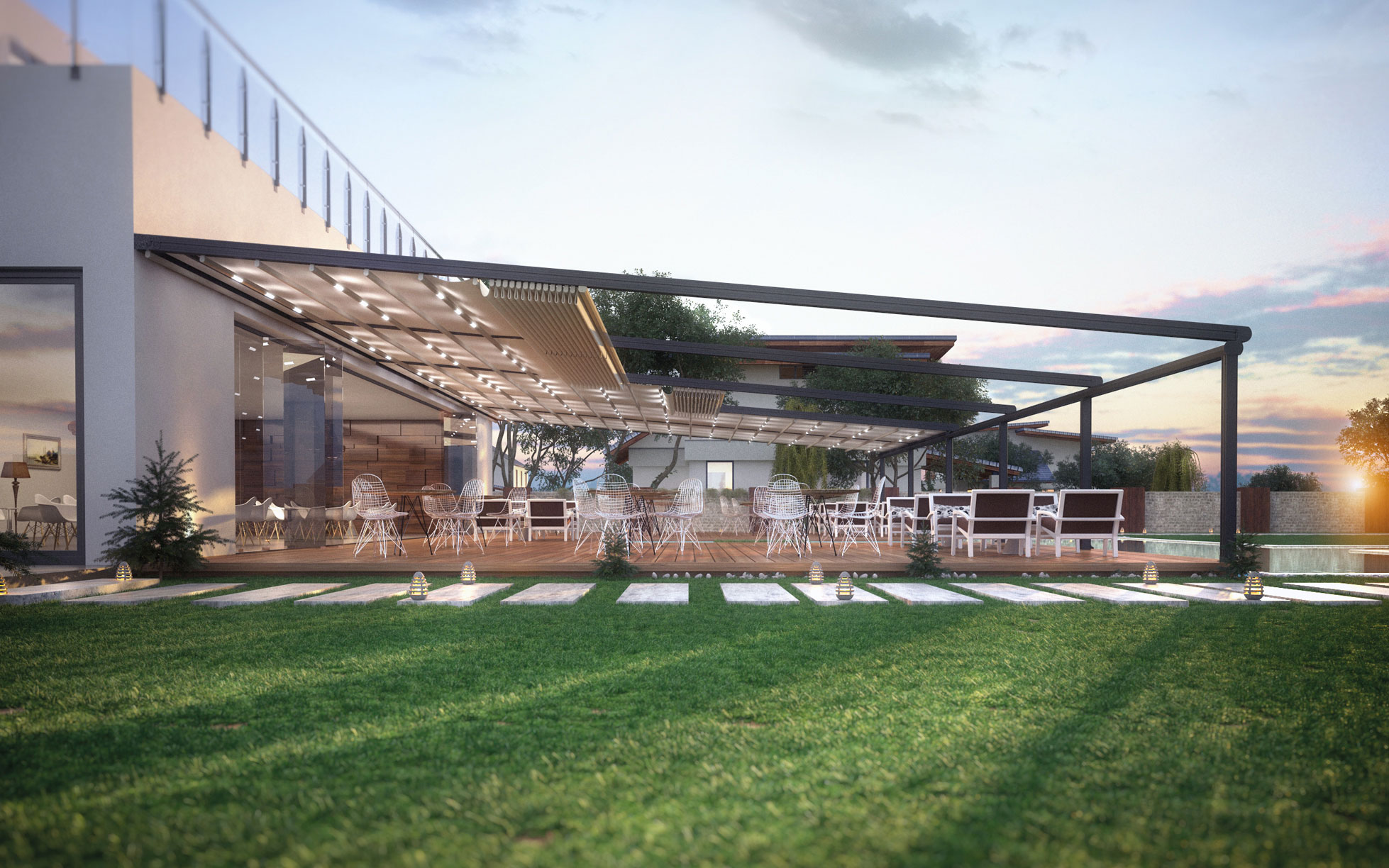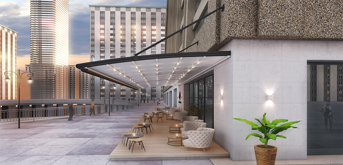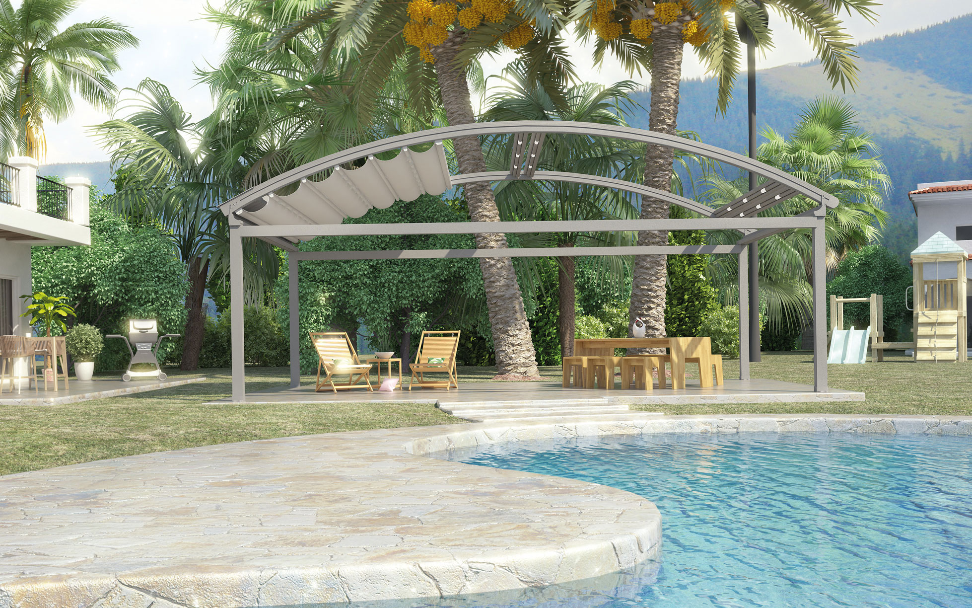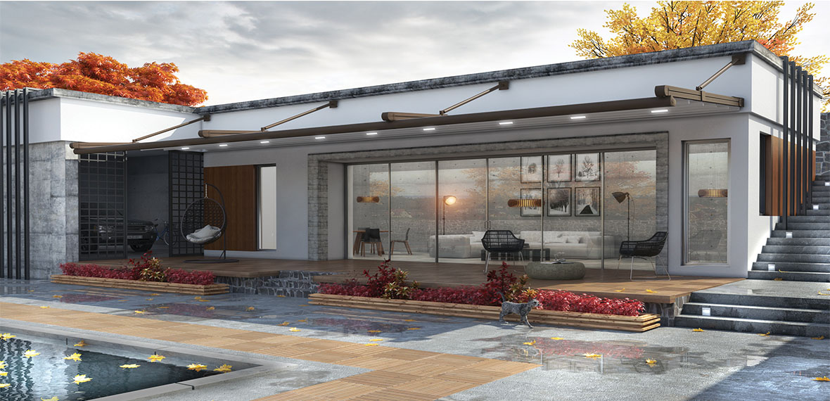 מערכת עצמאית העומדת על ארבעת עמודי תמיכה ללא צורך בחיבור למבנה. הקימור המאפיין את המערכת מוסיף טאץ' מעוצב לכל חצר או שטח מסחרי ומהווה שיפוע למי הגשמים אשר מנוקזים לשני הקורות בצידי המערכת ומשם לעמודים. המודל מעניק כיסוי צל של עד 135 מטרים רבועים בלחיצת כפתור. בנוסף, המערכת מאפשרת שילוב של מגוון רכיבים אשר ישדרגו אותה ויהפכו אותה לרב תכליתית ואסתטית. דגם זה עובד היטב עם חיפוי זכוכית או כל חיפוי אחר.